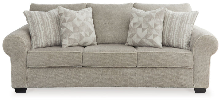Everyday form, superb function. Framed with roll arms for a dash of flair, this sofa sets its sights on trendy transitional design. The neutral hue meshes with multiple color palettes, providing chic seating wherever you need it most. Soft-to-the-touch fabric aids you in superior relaxation. Now that's universal style, made simple.