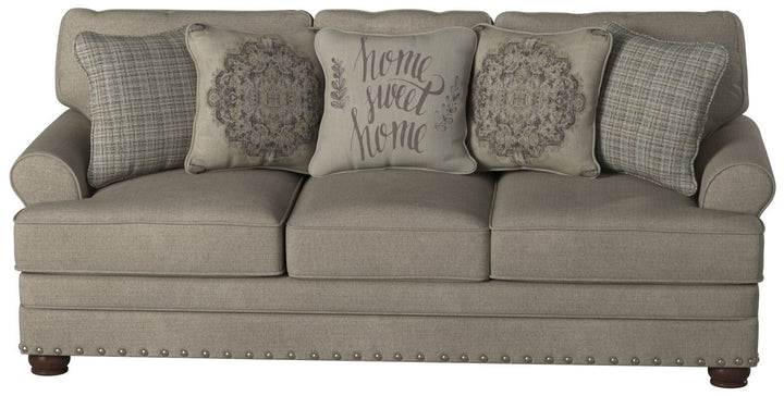 Built for comfort, the seats are constructed of individually pocketed coils encased in foam and topped with a layer of cool gel infused memory foam for a long lasting, comfortable, and supportive seat. Five included accent pillows add both plushness and personality to your space. The elegant wood bun legs provide stability and a nod to classic craftsmanship, while the exquisite nail head accents on the front rail bring a touch of character and detail that captures the essence of timeless beauty.