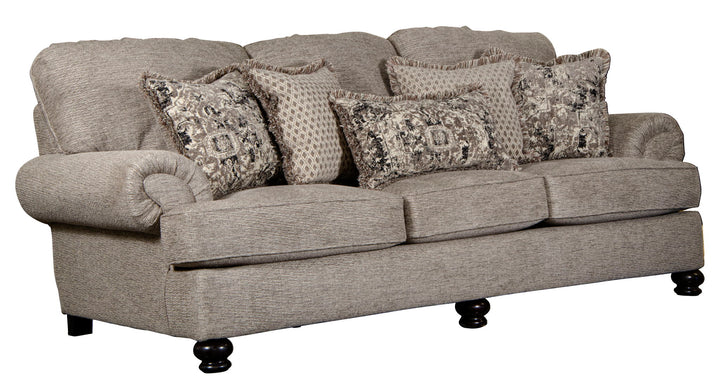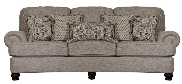 Freemont is a big, deep Traditional rolled arm design with wooden legs and correlating toss pillows in decorative fringe. Details Large Family Room Traditional Design Offering Deep Seating Comfort Reversible Box Welted Seat Cushions Five Versatile Two-Toned Decorative Fringed Pillows Solid Wood Accent Legs Steel Tech Framing Comfort Coil Seating featuring Comfor-Gel