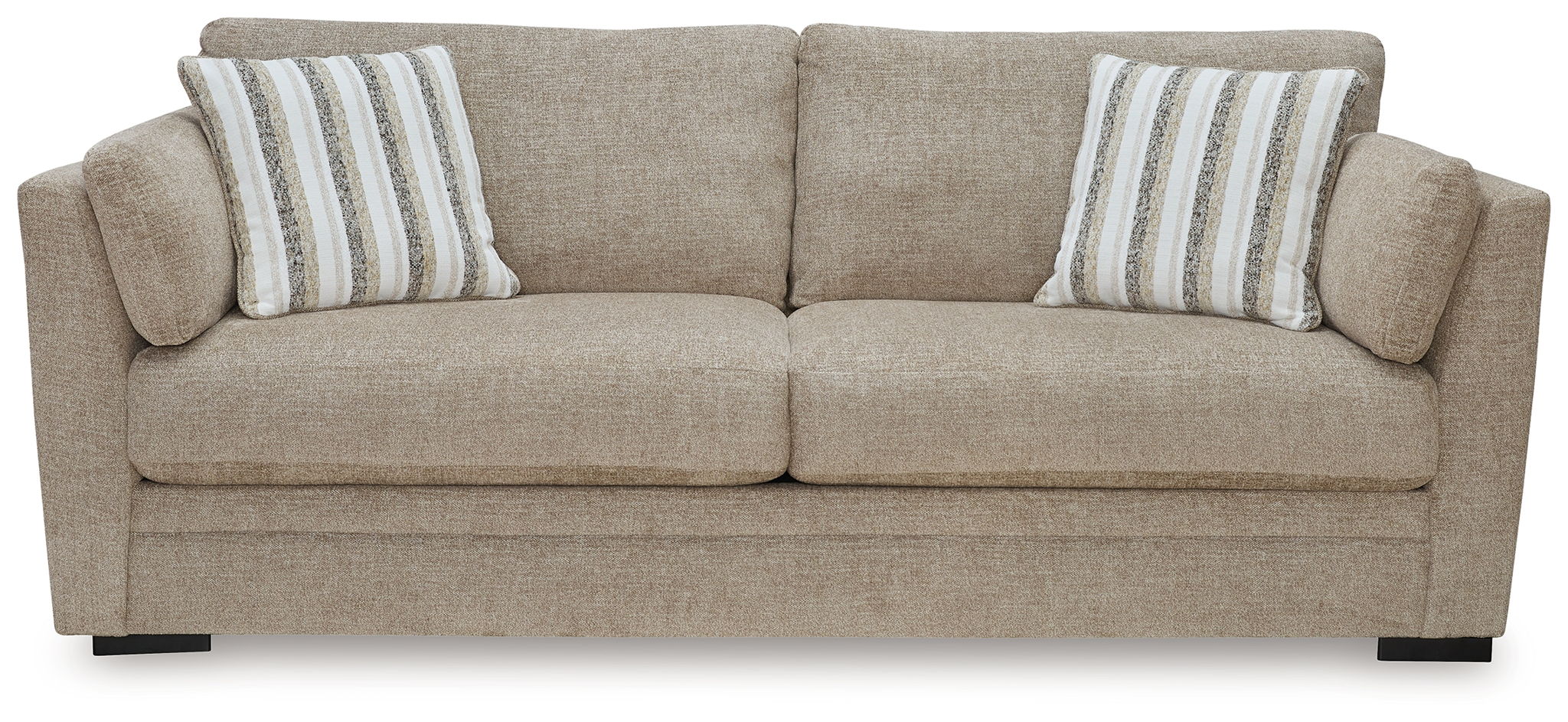 Looking for the perfect blend of decadent comfort and contemporary flair? You've gotta check out this sofa. With its plump cushions, plush chenille fabric and softly tapered arms, this piece makes it easy to lounge solo or with a friend in stunning style. Arm bolster pillows and striped accent pillows are icing on the comfort cake.