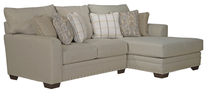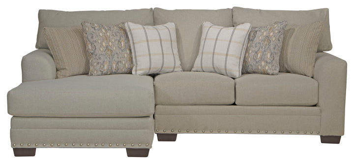 The contemporary farmhouse styling of the Middleton sectional brings comfort and style to any room. The seats are constructed of individually pocketed coils encased in foam and topped with a layer of cool gel infused memory foam for a long lasting, comfortable and supportive seat. Covered in a soft, durable 100% polyester fabric in a light gray color the Middleton is durable enough for use in a family room, basement or bonus room. The exceptional styling shows through with the included decorator accent pillows and nickel nail head accents along the base rail.