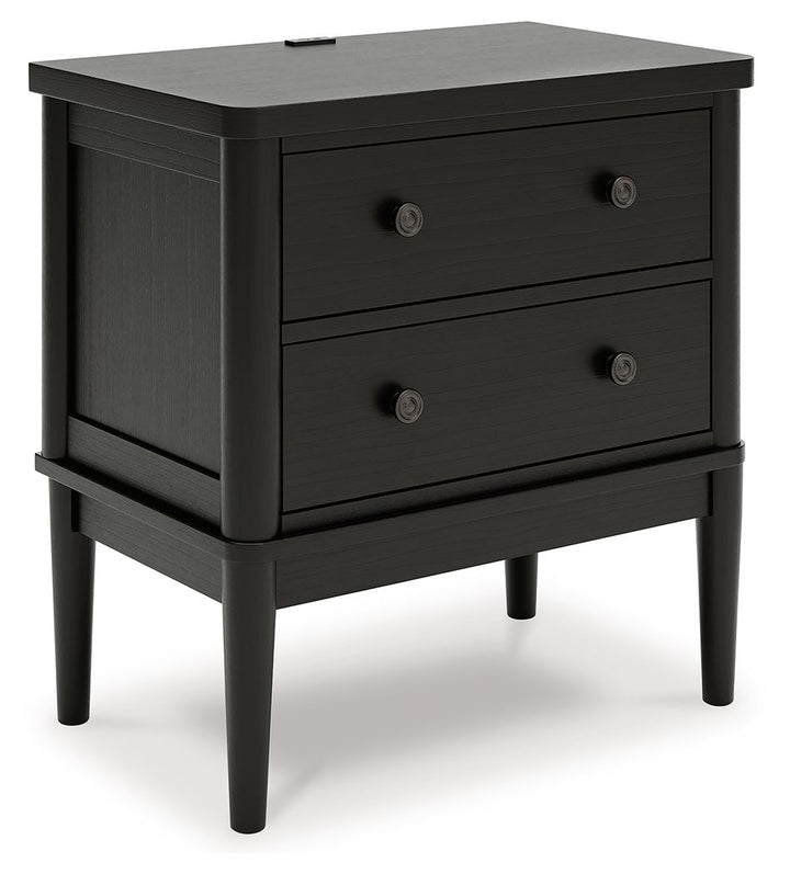 Farmhouse and contemporary design, balanced beautifully. This nightstand merges a clean-lined silhouette and round posts for an updated sensibility. Simple inset drawer fronts and spacious drawers for nighttime necessities stack up to on-trend form and function. A modern French black finish with deep warm brown undertones perfectly punctuates this casually inviting piece. And charging your devices is easier than ever, thanks to the USB ports integrated into the top.