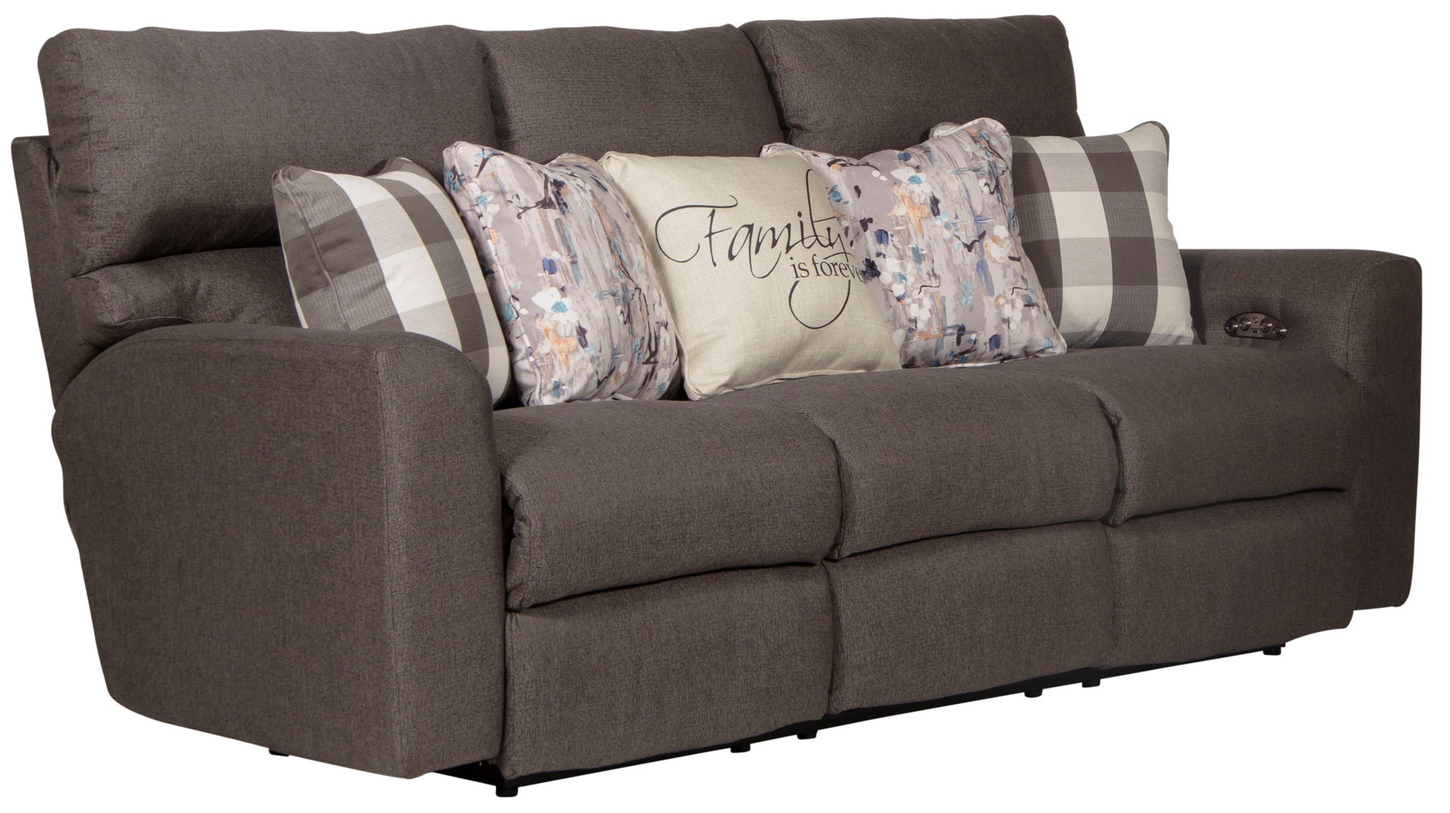 Searsport is a Casual Farmhouse design with our Power Recline/Power Headrest features. A fashionable mix of accent pillows includes a "Family is Forever" emoji pillow. Searsport is available in your choice of two colors - Buff or Metal.