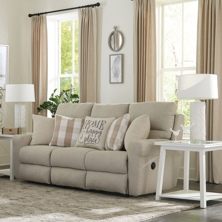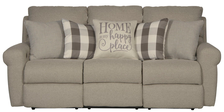 The WESTPORT lay flat reclining sofa features a Farmhouse Casual style with its Greek Key arm treatment, soft body fabric, and 5 included accent pillows.